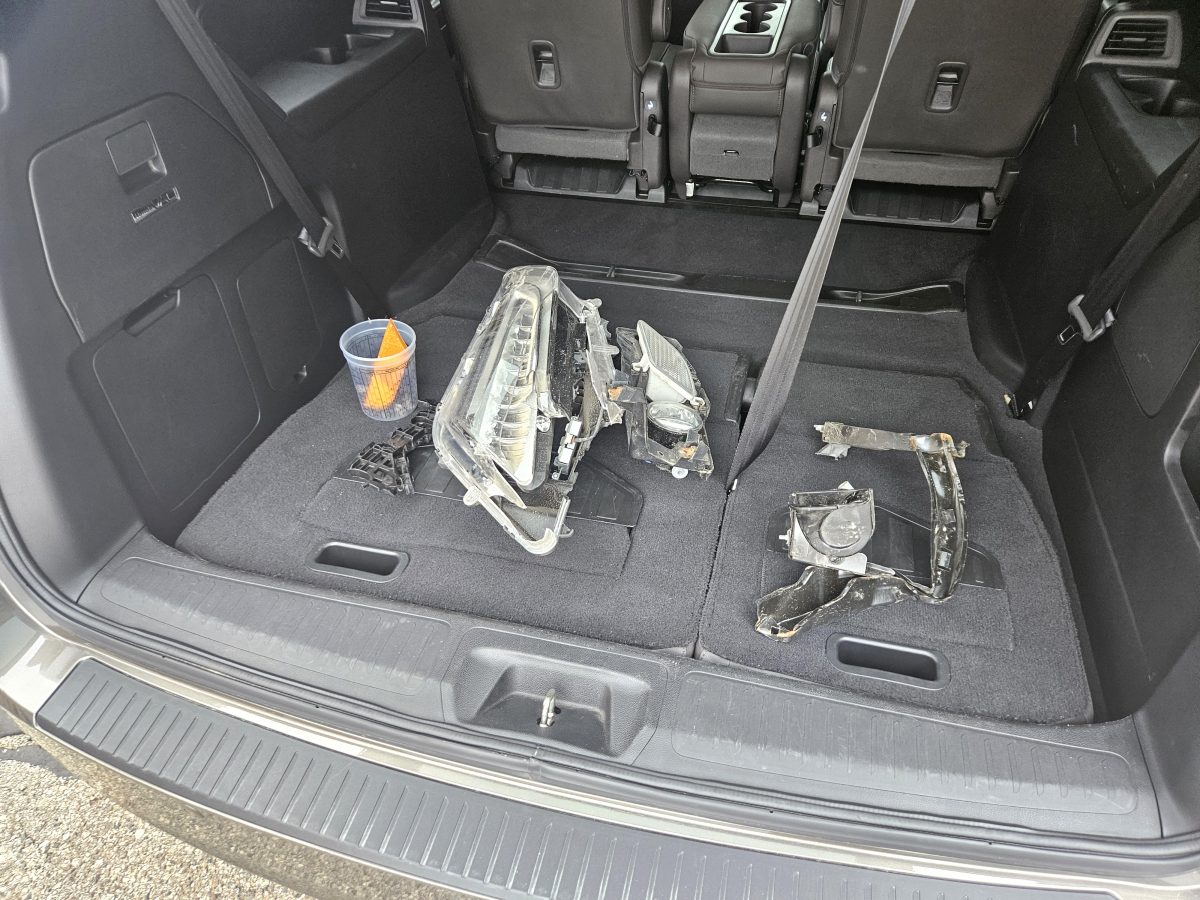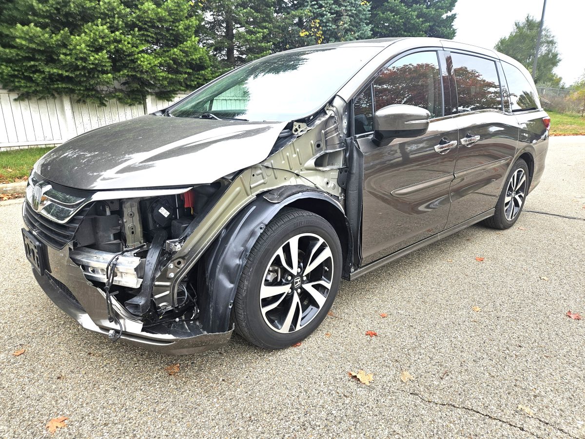 Needs these major parts: front bumper cover, L headlight and L fender. Minor LF lower inner structure repaired. Driver steering wheel and knee airbags and driver seatbelt have been replaced. Minor RR lower bumper cover scratch. Good unibody frame, coolers, hood, support, inner strtucture, glass, airbags, seatbelts and suspension. Clean interior. Missing floor mats. Decent rear tires. Nice van.